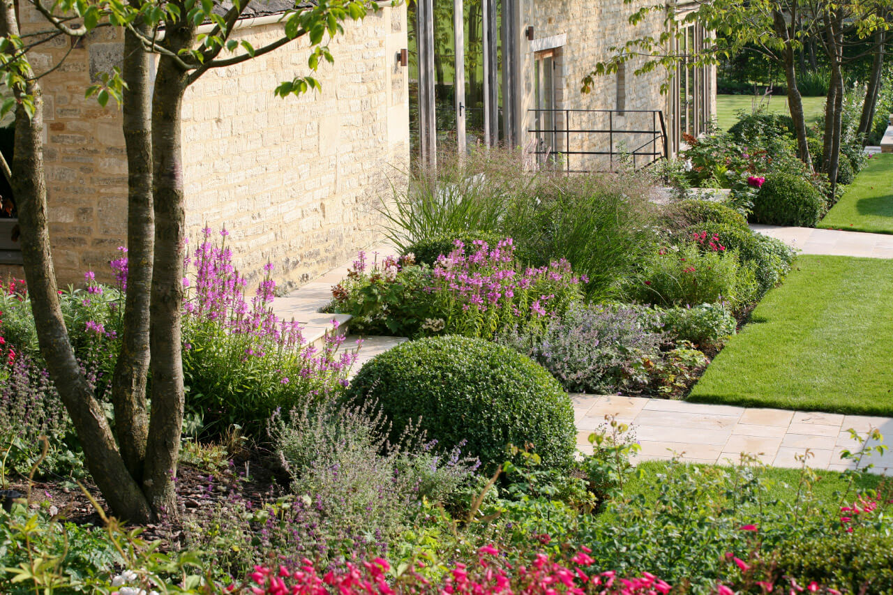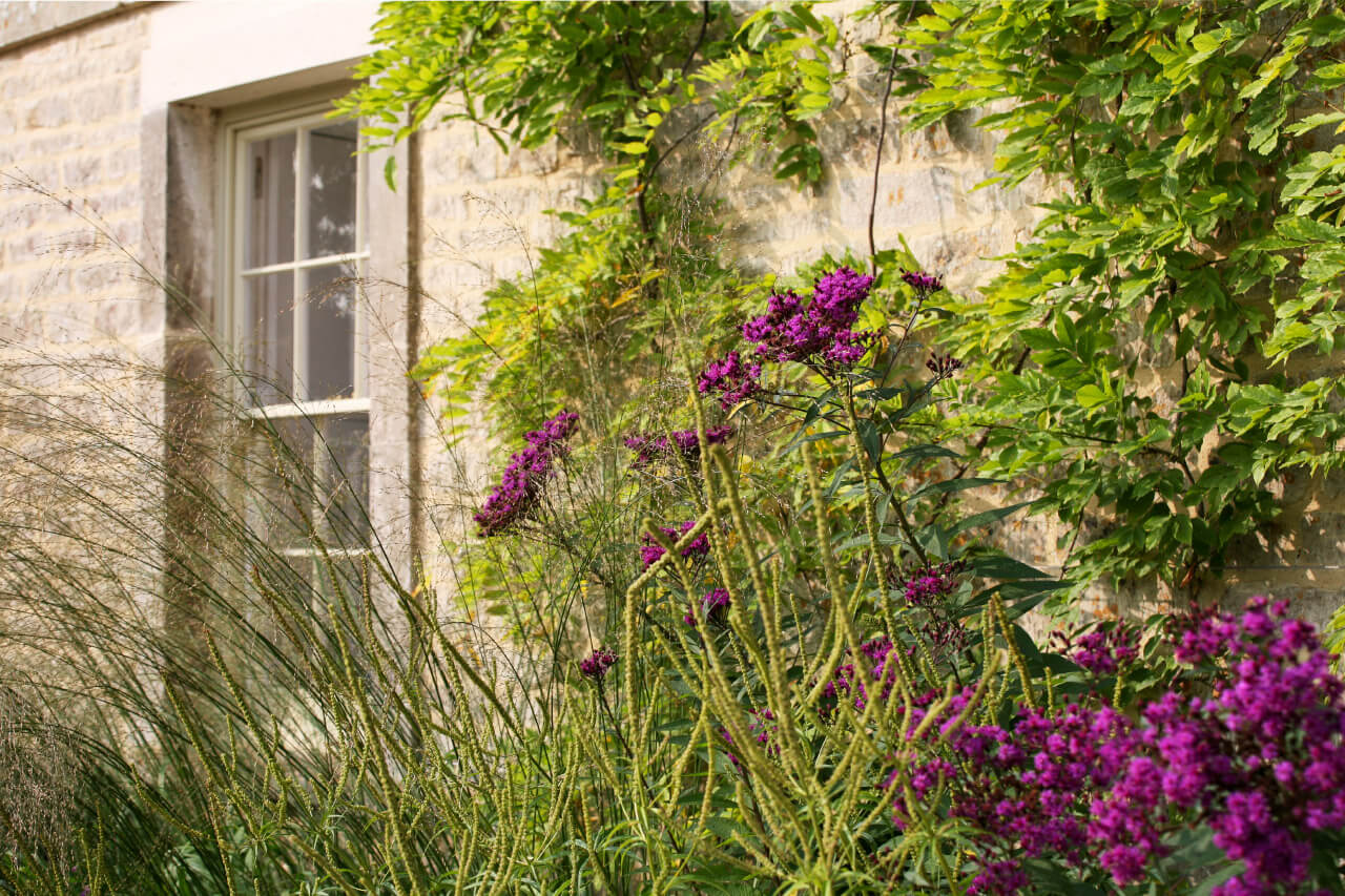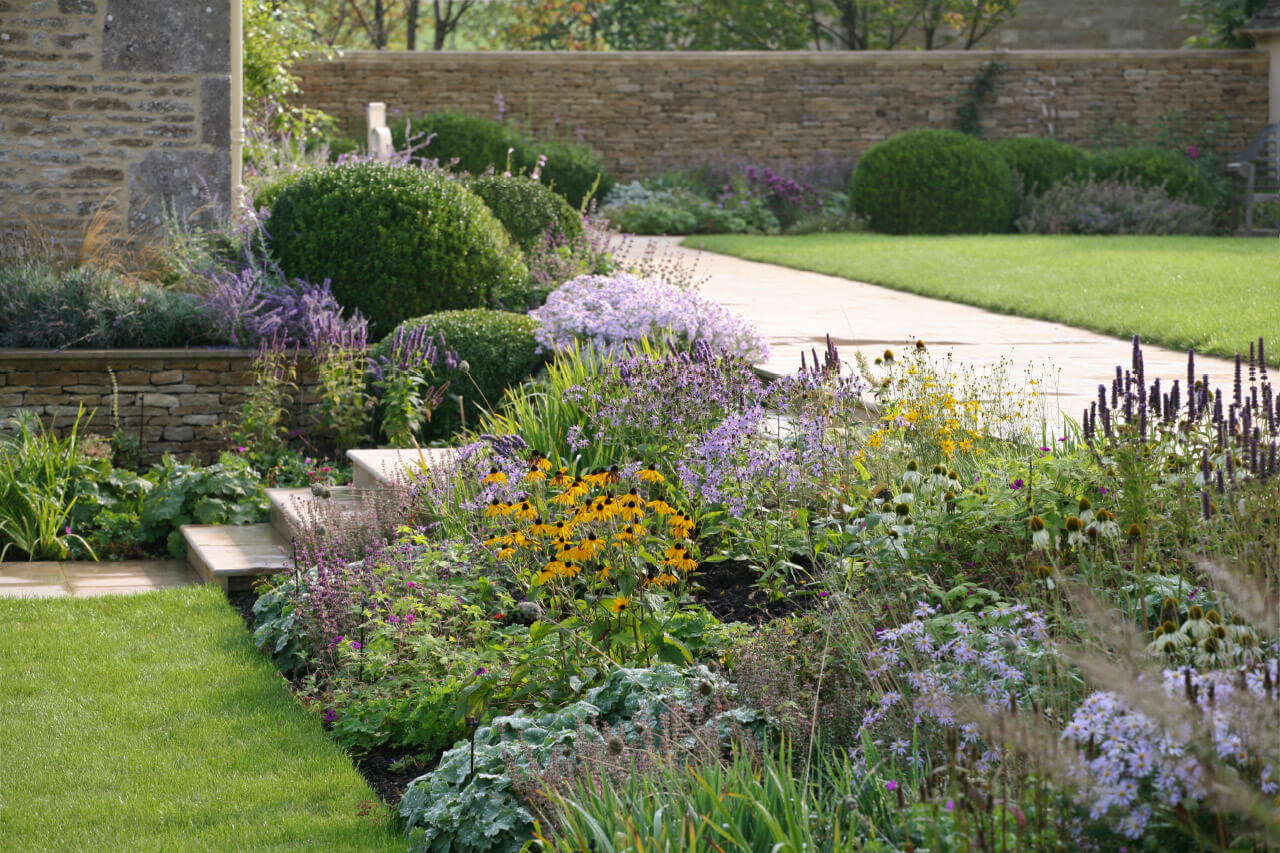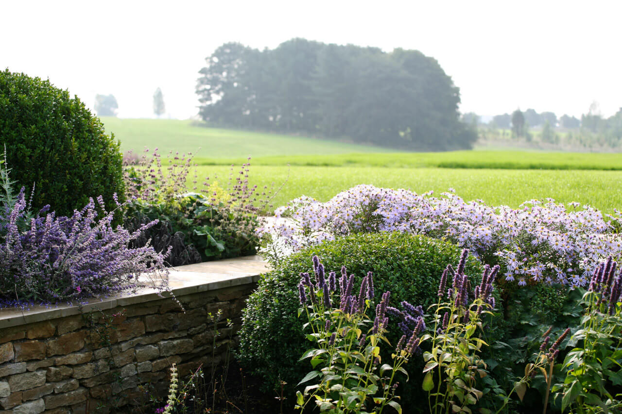 Modern techniques and design blended with vernacular tradition produce a finely crafted hard landscape which is overlaid with deep, abundant borders of select perennials and grasses.